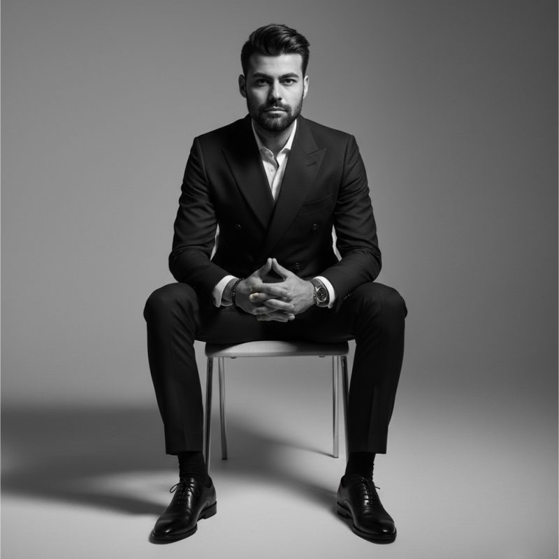 با استفاده از این پرامپت در هوش مصنوعی Nano Banana می توانید یک فتوگرافی آتلیه ای سیاه و سفید با کت و شلوار مشکی از خودتون بسازین